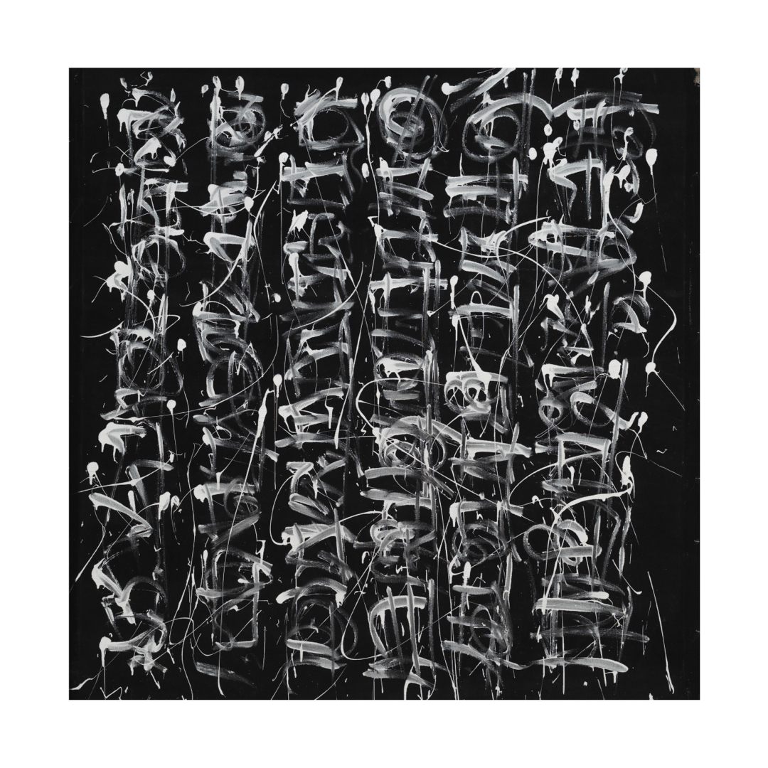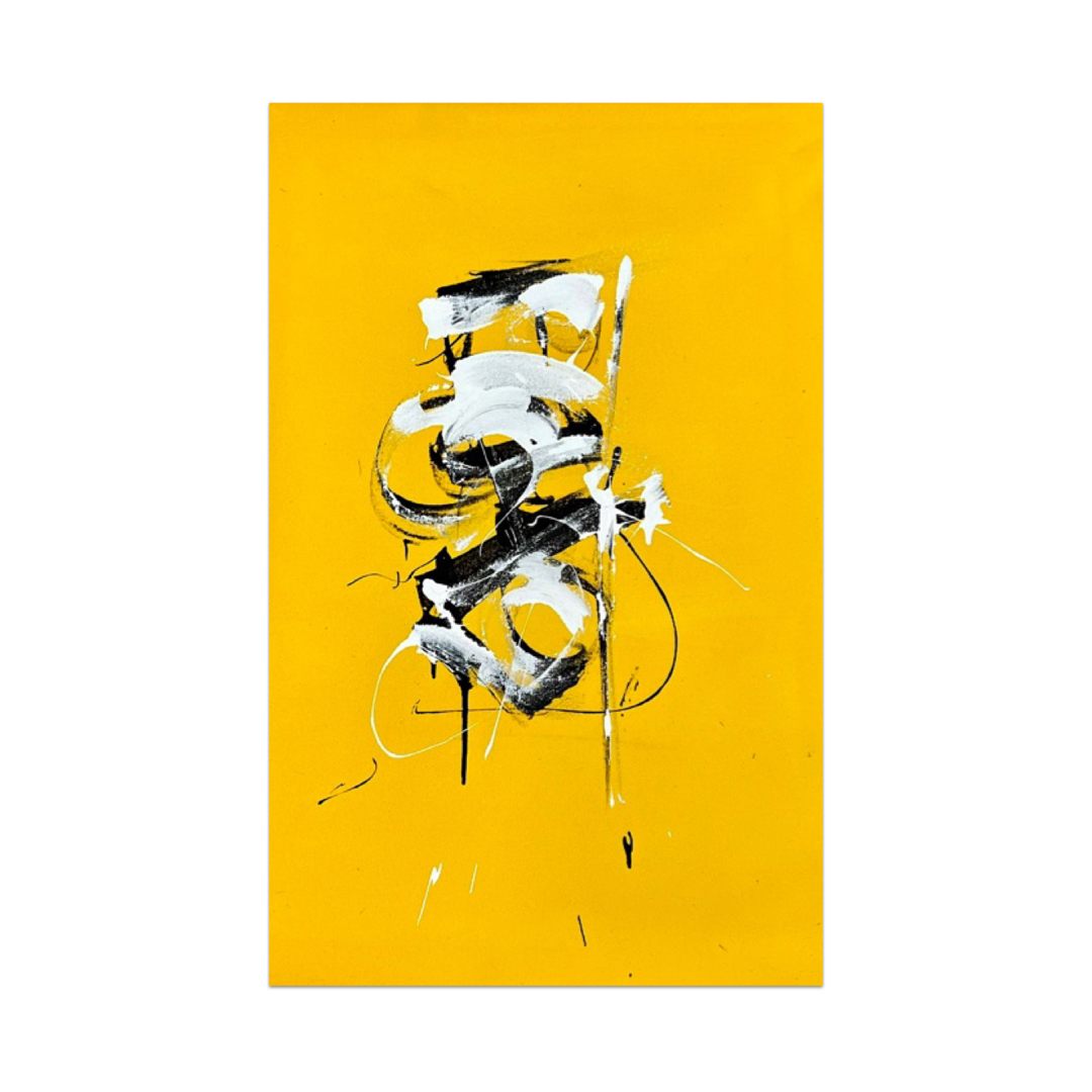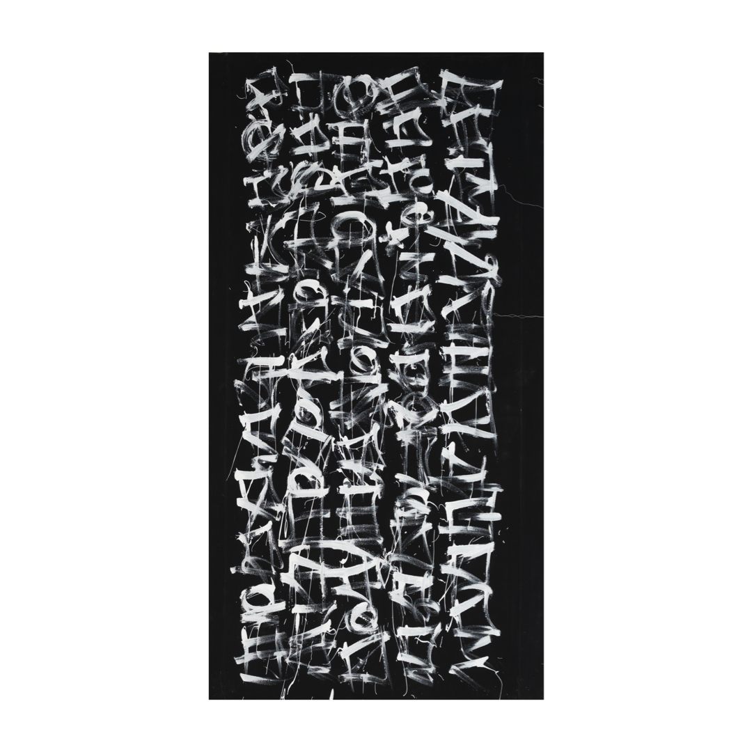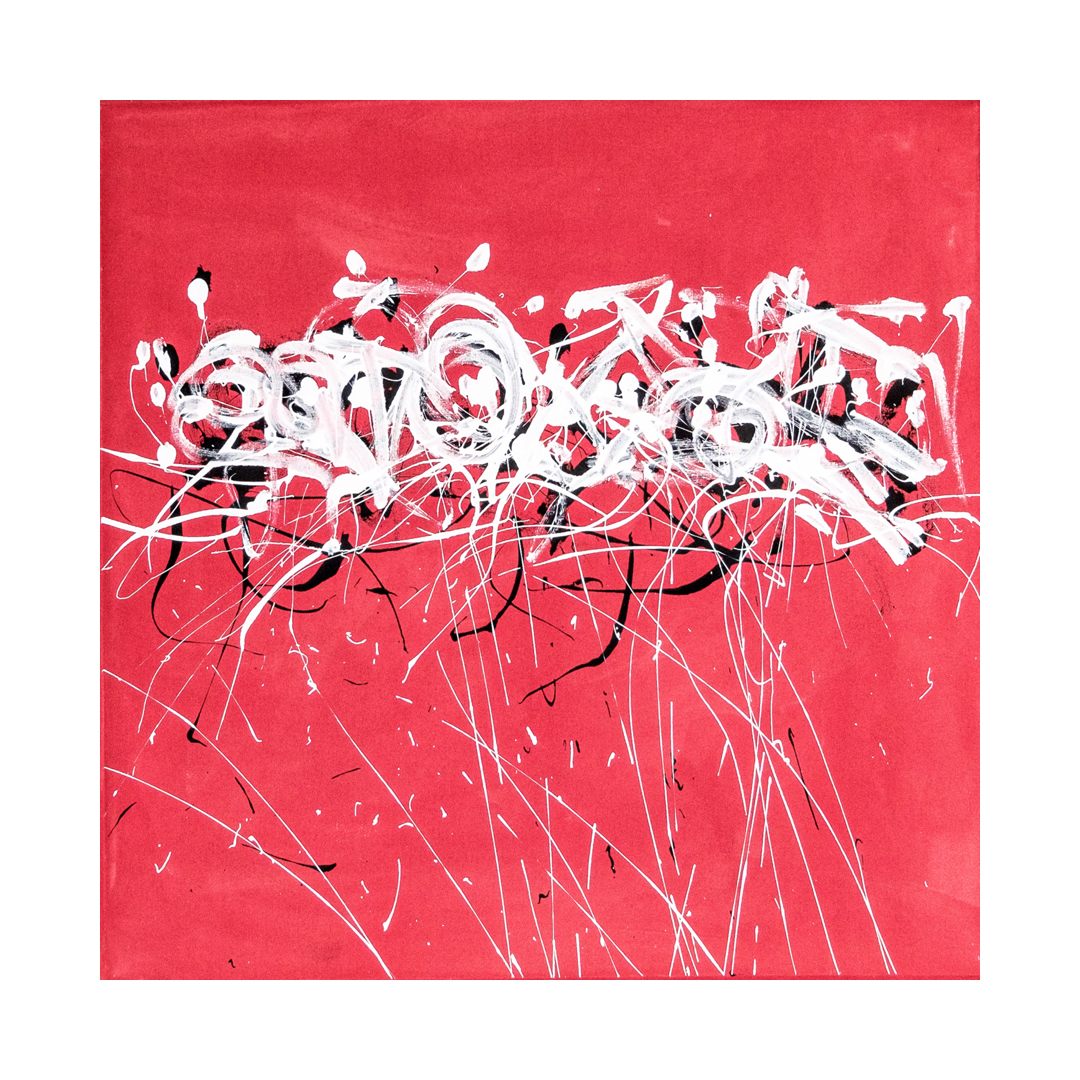 In these works, Motta uses energetic asemic strokes alongside graffiti and abstract motifs. Asemic art is a form of visual art that uses marks, symbols, or “writing-like” gestures that have no specific semantic meaning. The paint is applied with credit cards and uncleaned brushes where the paint has dried in order to achieve a hard calligraphic edge. The paintings are produced to look like they are saying something, with the brushstrokes implying the meaning rather than a definitive set of letters, building on the rich history of Asemic art/writing.