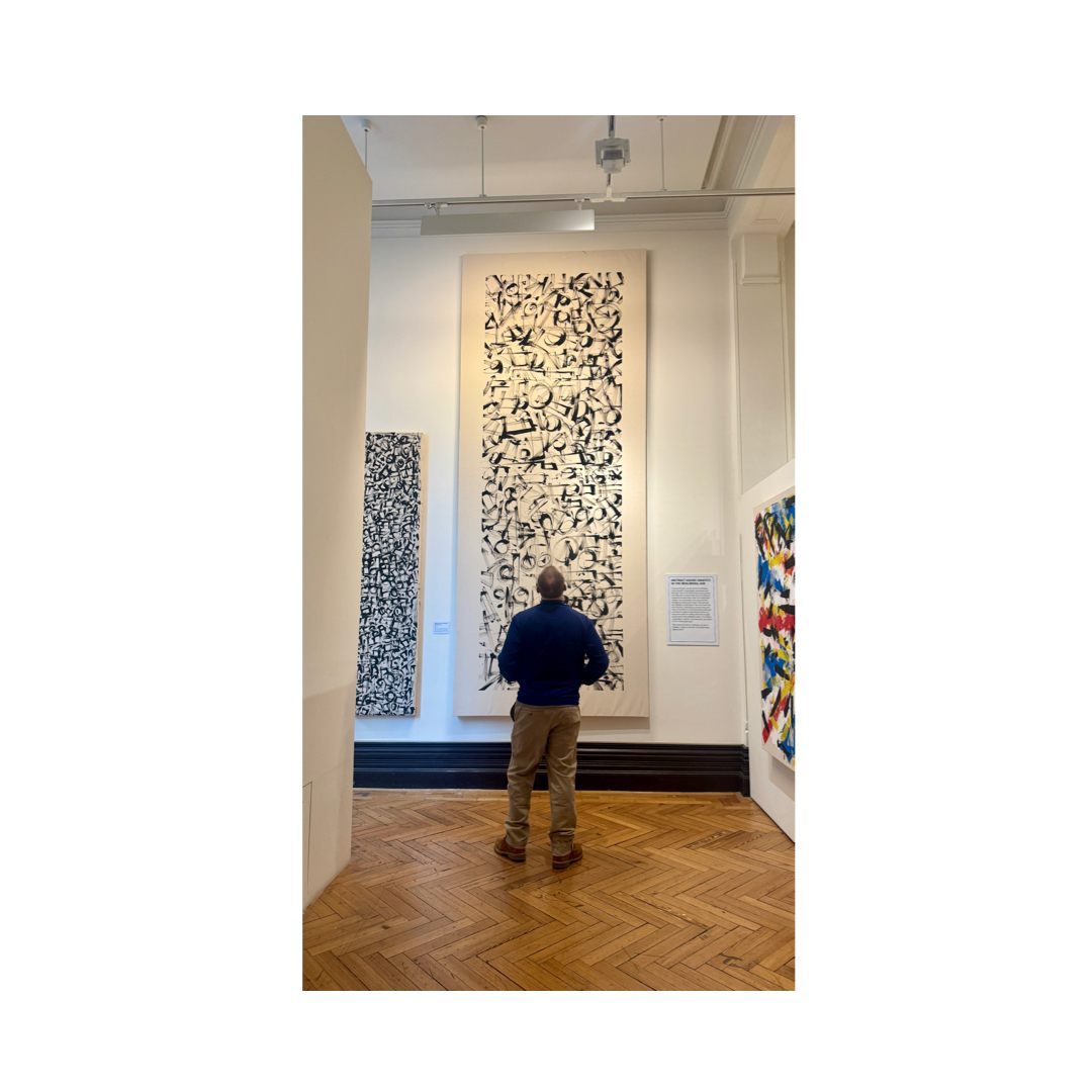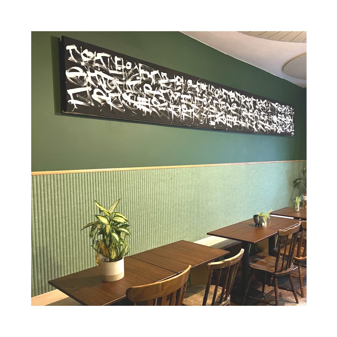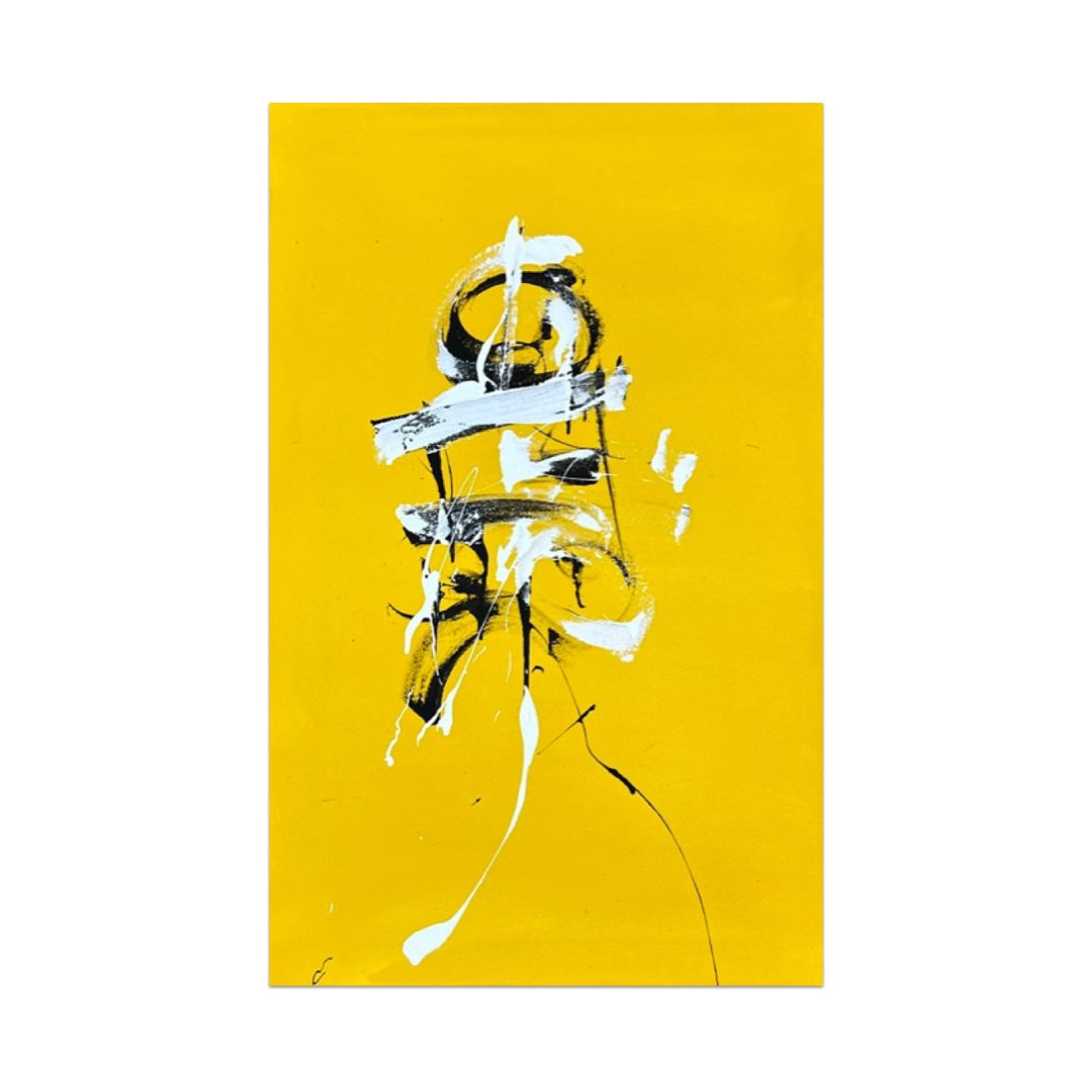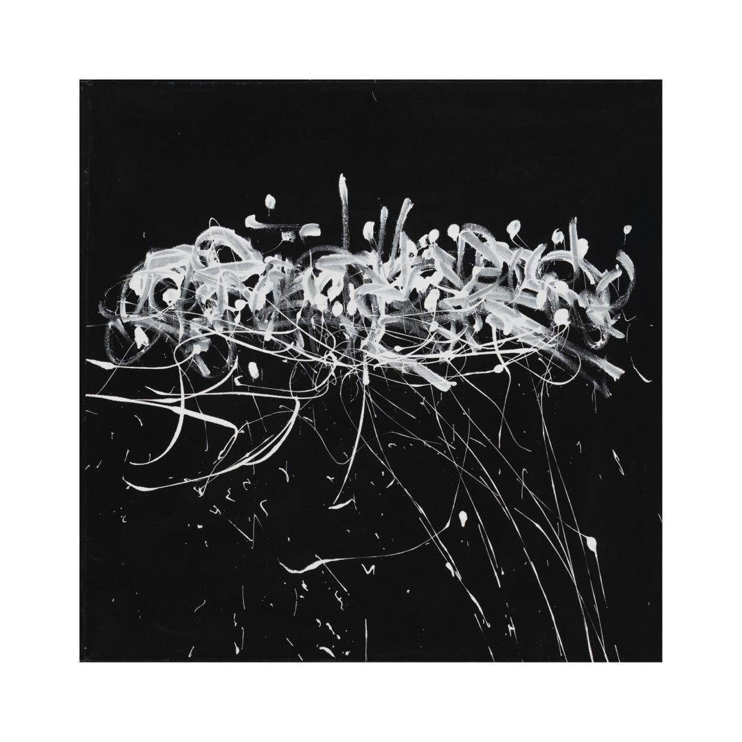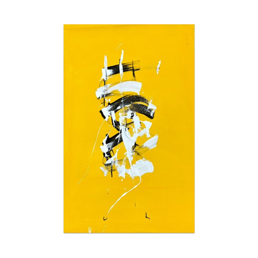 In these works, Motta uses energetic asemic strokes alongside graffiti and abstract motifs. Asemic art is a form of visual art that uses marks, symbols, or “writing-like” gestures that have no specific semantic meaning. The paint is applied with credit cards and uncleaned brushes where the paint has dried in order to achieve a hard calligraphic edge. The paintings are produced to look like they are saying something, with the brushstrokes implying the meaning rather than a definitive set of letters, building on the rich history of Asemic art/writing.